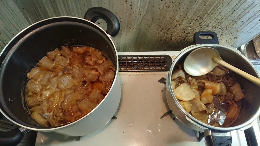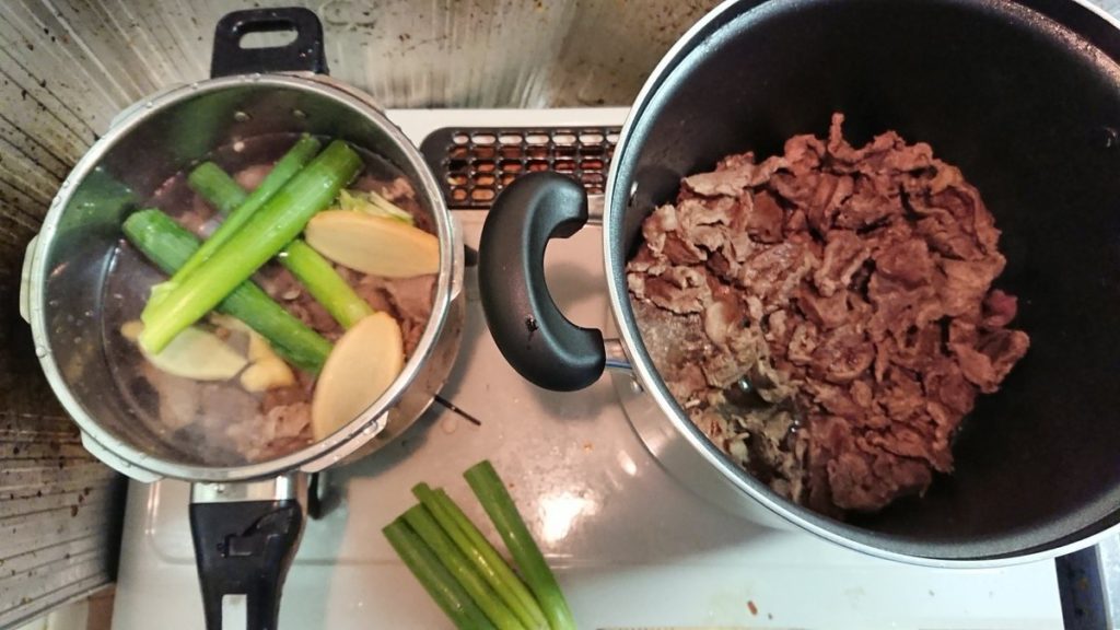 3. 入りきらなかったので寸胴と圧力鍋で分けました