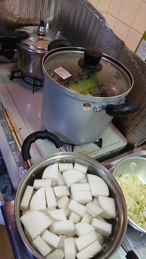 7. 醤油、みりん、酒、砂糖を適度に入れてネギの下の輪切り、こんにゃく、大根を入れて1時間ぐらい煮込む